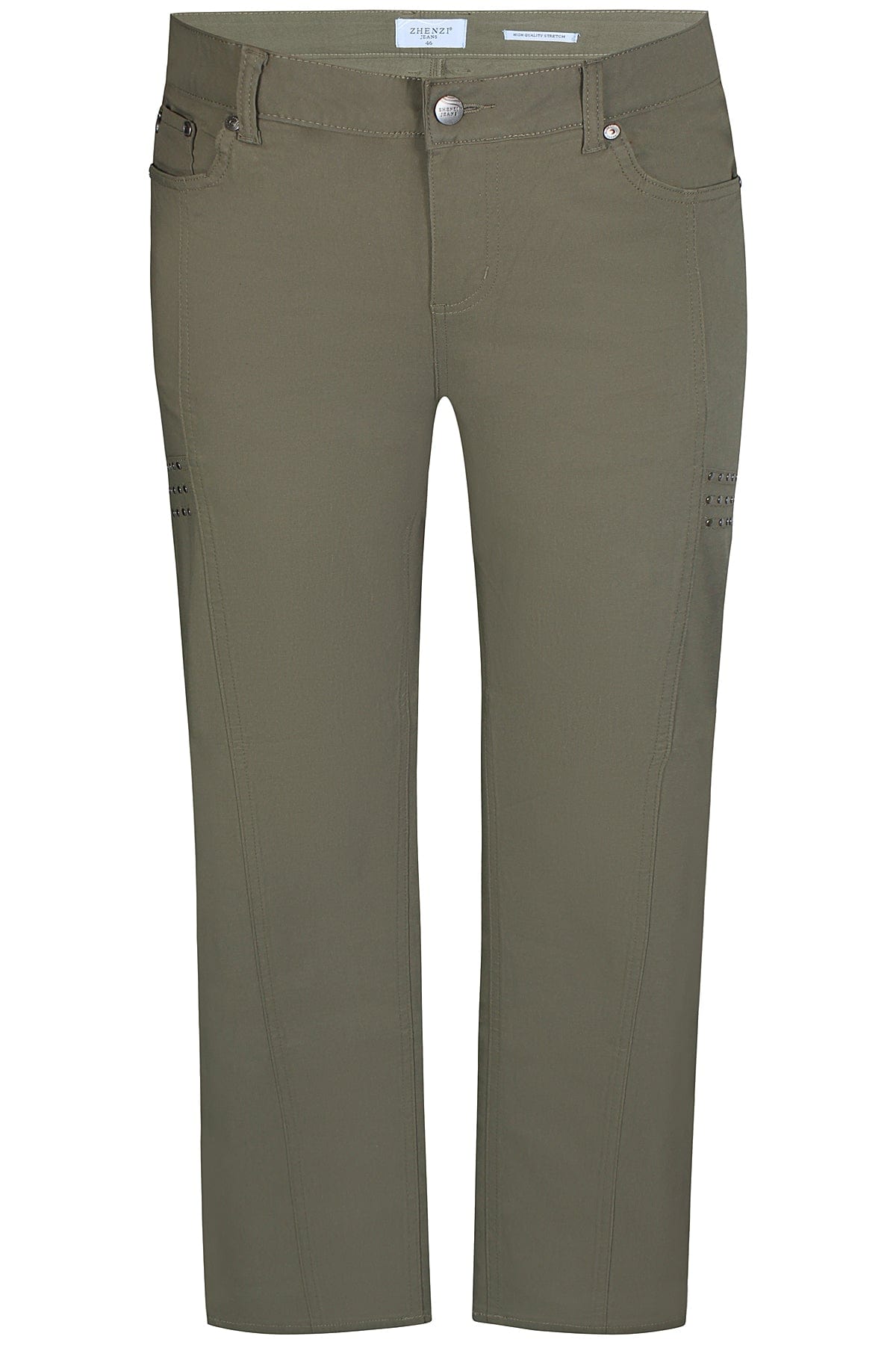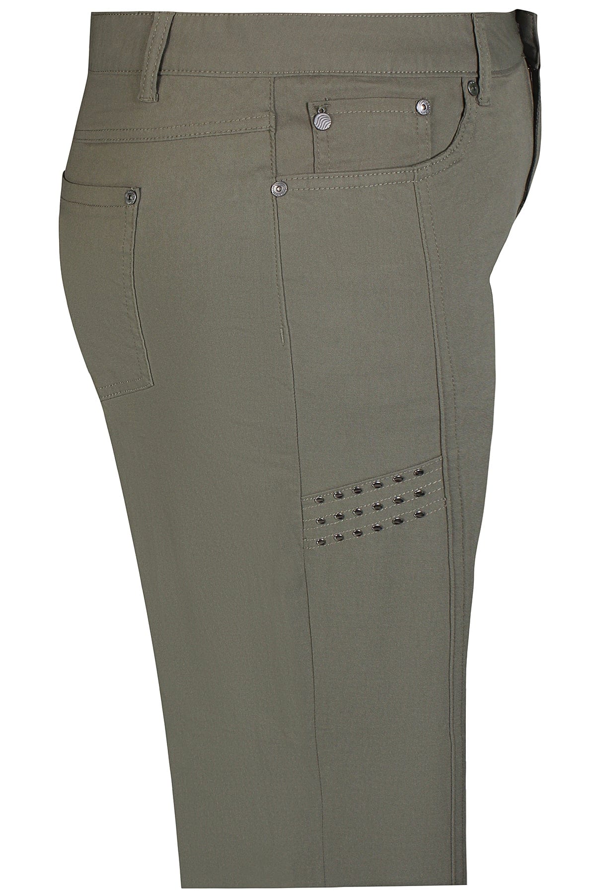 Bukser i bengalin med mye stretch, rette ben og pyntedetaljer øverst på låret. Buksen har knapp og glidelås i linningen og muligheter for å stamme på innsiden av linningen. Lommer foran og bak og beltestropper.